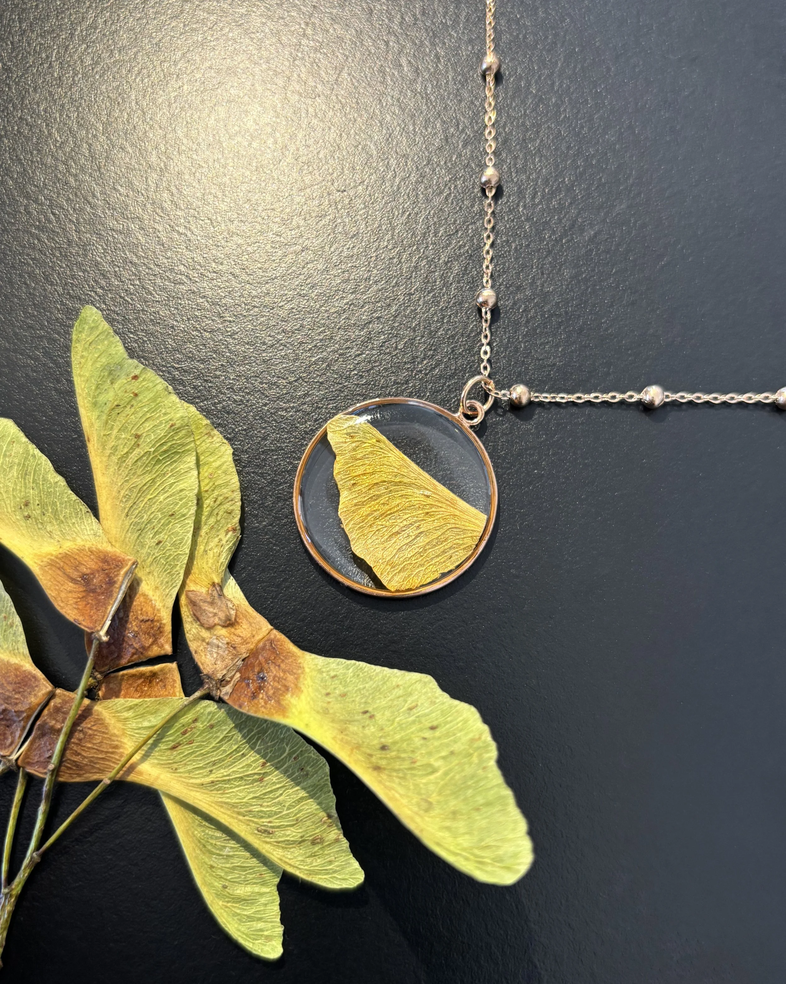 Die Geschichte meiner naturinspirierten Schmuckstücke beginnt fast immer draußen – bei einem Spaziergang oder einer Wanderung. Unterwegs in der Natur entdecke ich oft kleine Schätze: ein besonders geformtes Blatt, eine zarte Blüte oder eine interessante Samenkapsel. Wenn mich etwas anspricht, sammele ich es ein mit der Idee, diesen flüchtigen Moment der Natur später in Kunstharz zu verewigen.